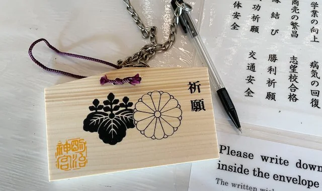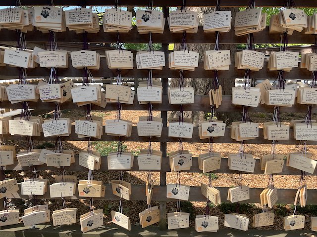 Ema (絵馬) are a wooden plaque in which people write prayers and then leave to hang at a Shinto/Buddhist shrine, where the spirits are believed to receive them (©2023, Deborah Clague).